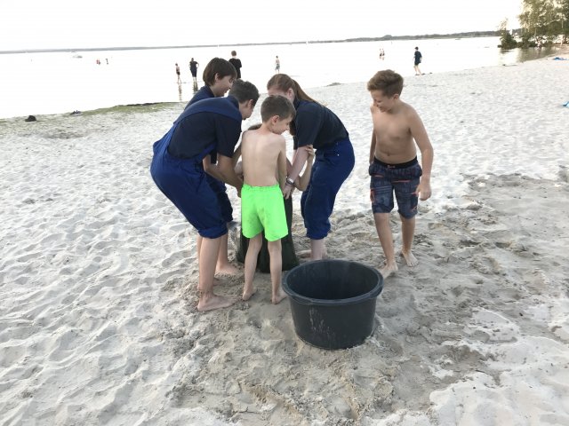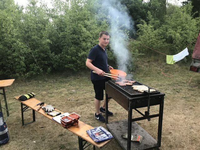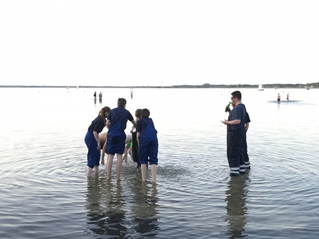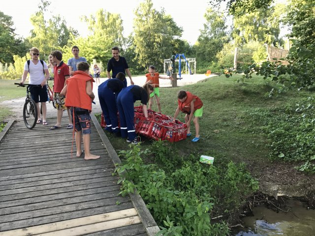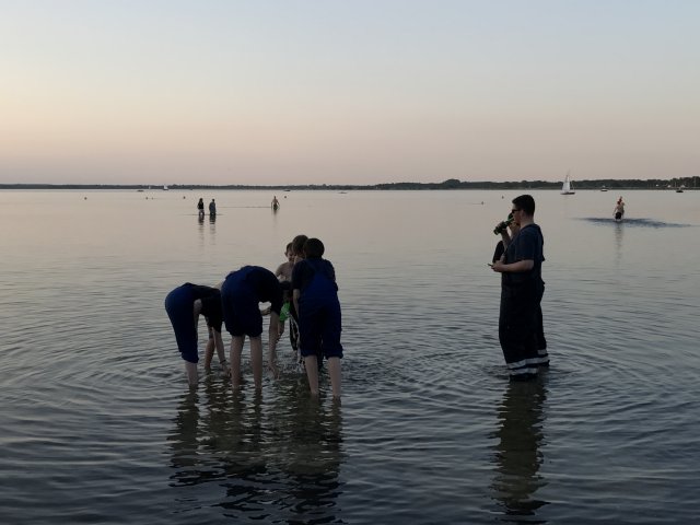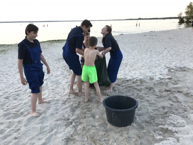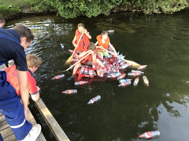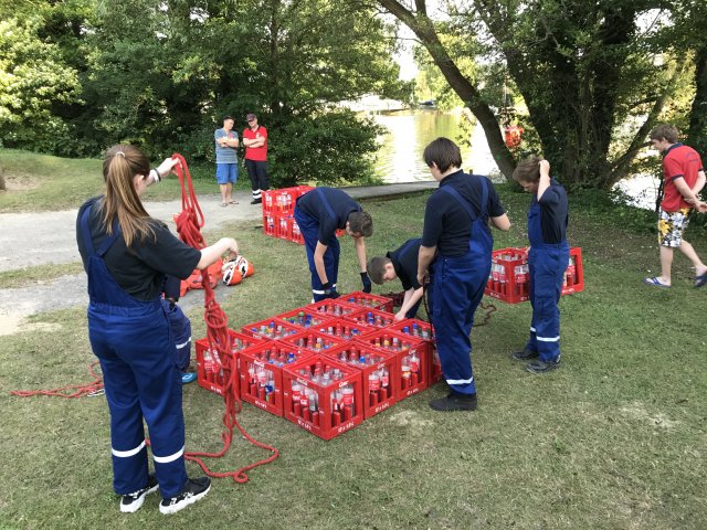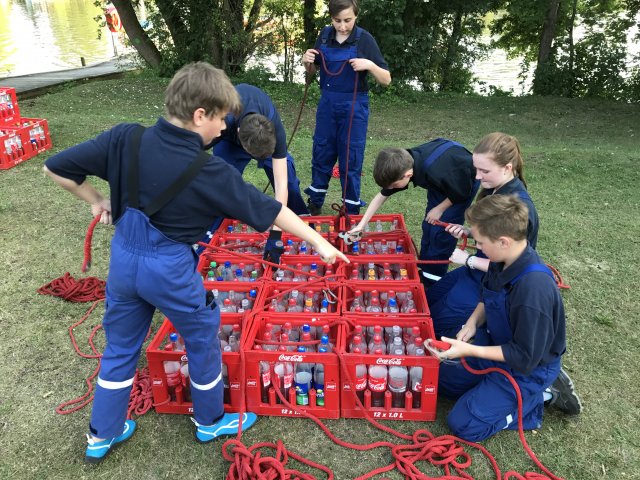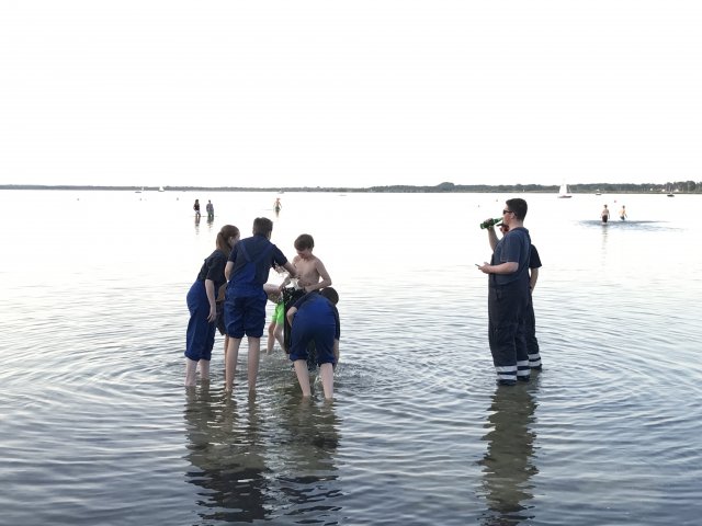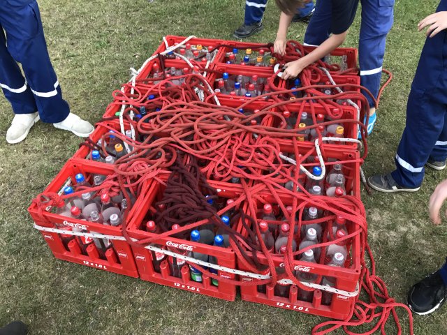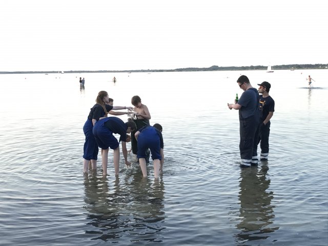 Dort angekommen hieß es erst einmal Zelte und Betten aufbauen. Nachdem jeder seinen Schlafplatz hergerichtet hatte, gab es Abendessen. Anschließend wurde ein Spiel ohne Grenzen veranstaltet, bei dem an verschieden Stationen auf der Insel spannende Aufgaben gemeistert werden mussten. Zu den Aufgaben zählte unter anderem das Bauen eines Floßes aus – mit leeren Flaschen gefüllten – Getränkekisten. Die Kisten mussten mittels Feuerwehrleinen zusammengebunden werden. Mit dem Floß sollten dann etwa 10 Meter auf dem Steinhuder Meer zurückgelegt werden. Für jede verlorene Flasche gab es Strafpunkte. Auch wenn sich am Ende nur noch eine Flasche in den Kisten befand, machte diese Aufgabe viel Spaß! Nachdem alle Aufgaben mehr oder weniger erfolgreich beendet wurden, saßen wir noch gemütlich vor unseren Zelten. Gegen 22 Uhr ging es dann ins Bett.