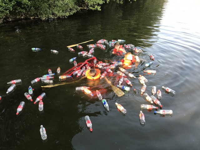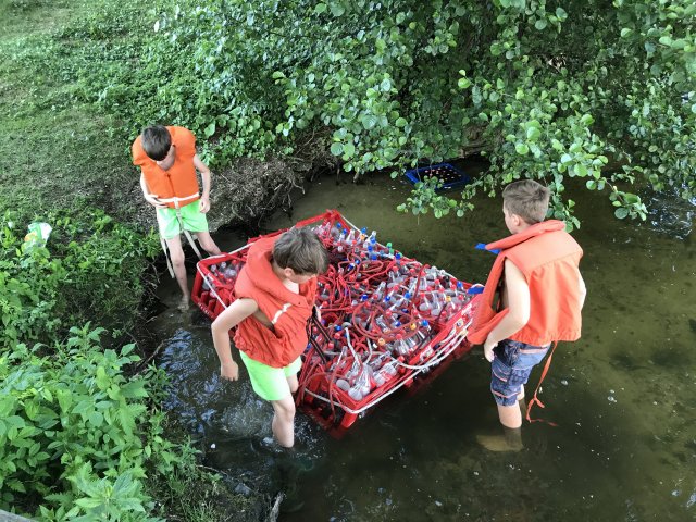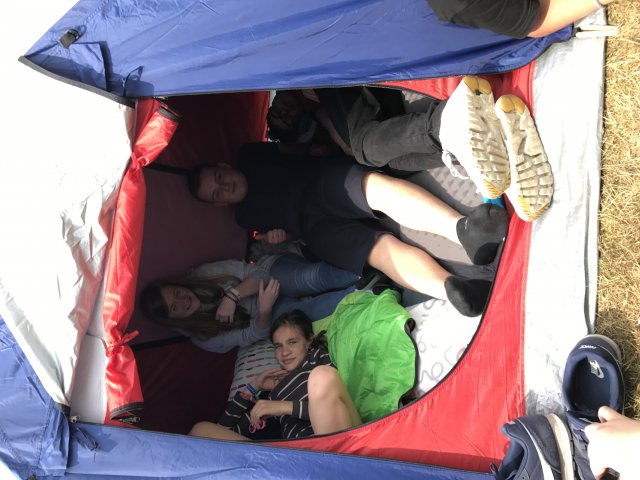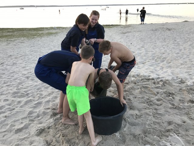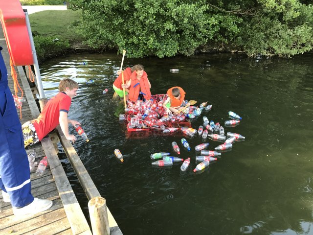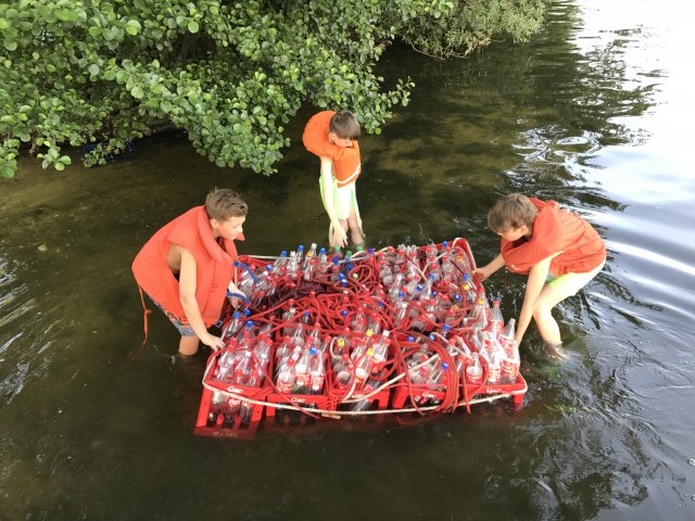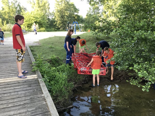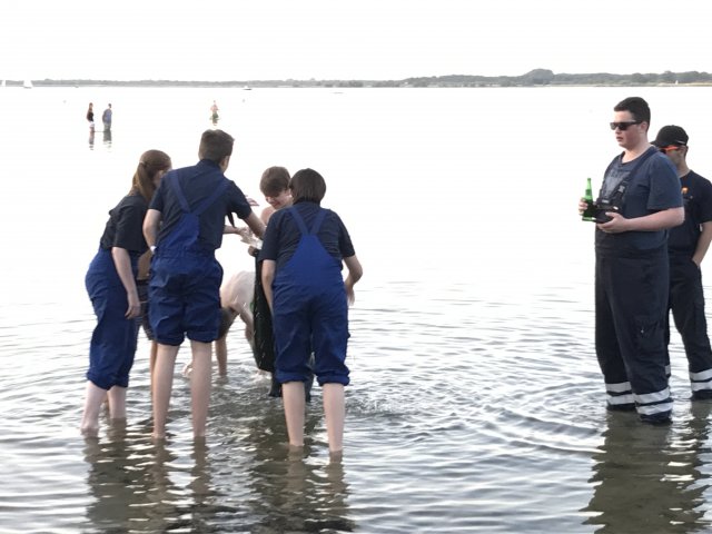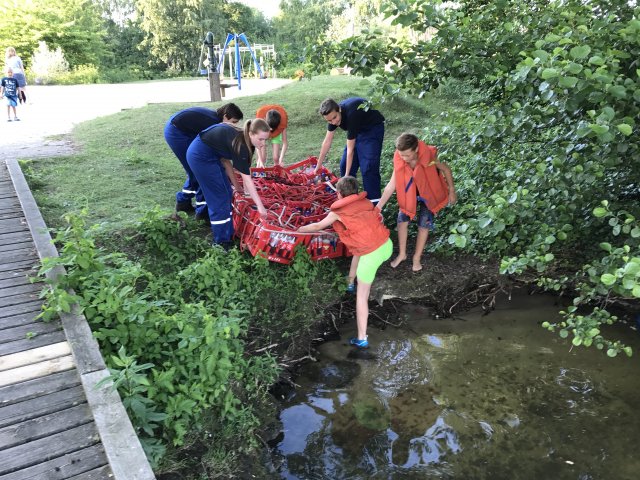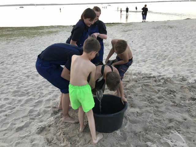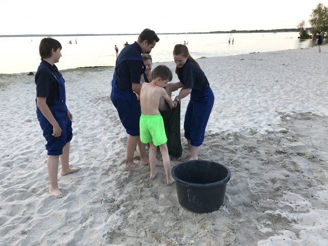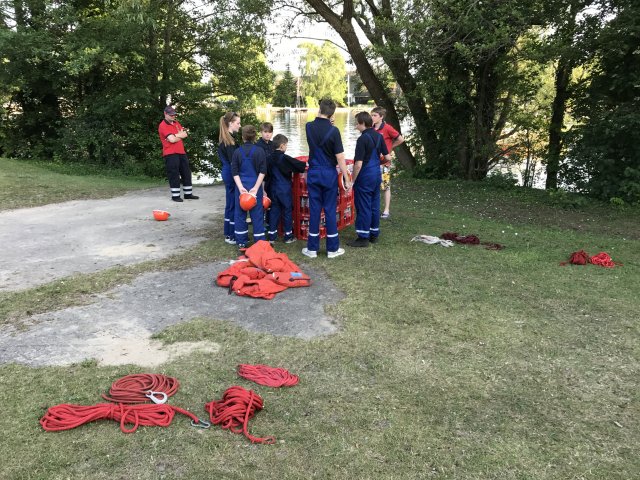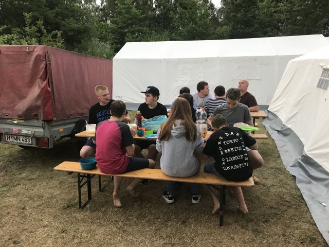 Dort angekommen hieß es erst einmal Zelte und Betten aufbauen. Nachdem jeder seinen Schlafplatz hergerichtet hatte, gab es Abendessen. Anschließend wurde ein Spiel ohne Grenzen veranstaltet, bei dem an verschieden Stationen auf der Insel spannende Aufgaben gemeistert werden mussten. Zu den Aufgaben zählte unter anderem das Bauen eines Floßes aus – mit leeren Flaschen gefüllten – Getränkekisten. Die Kisten mussten mittels Feuerwehrleinen zusammengebunden werden. Mit dem Floß sollten dann etwa 10 Meter auf dem Steinhuder Meer zurückgelegt werden. Für jede verlorene Flasche gab es Strafpunkte. Auch wenn sich am Ende nur noch eine Flasche in den Kisten befand, machte diese Aufgabe viel Spaß! Nachdem alle Aufgaben mehr oder weniger erfolgreich beendet wurden, saßen wir noch gemütlich vor unseren Zelten. Gegen 22 Uhr ging es dann ins Bett.