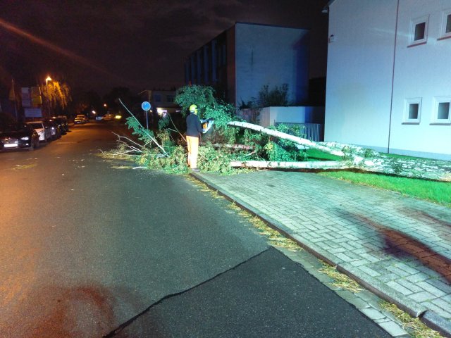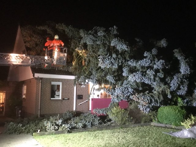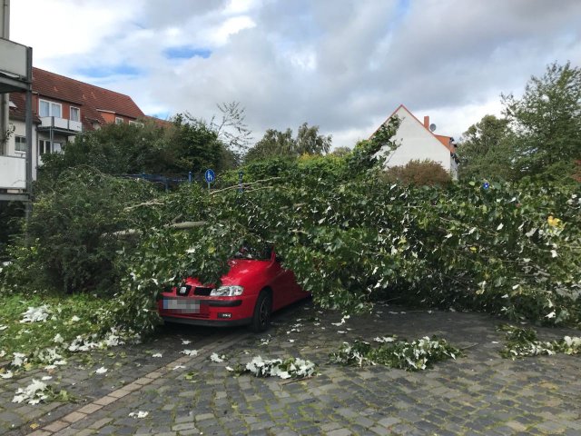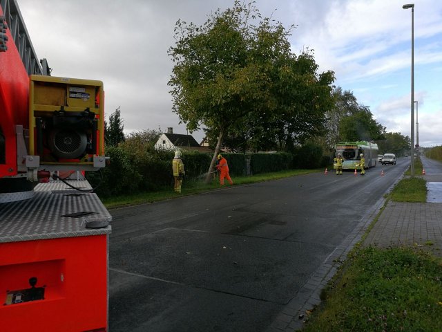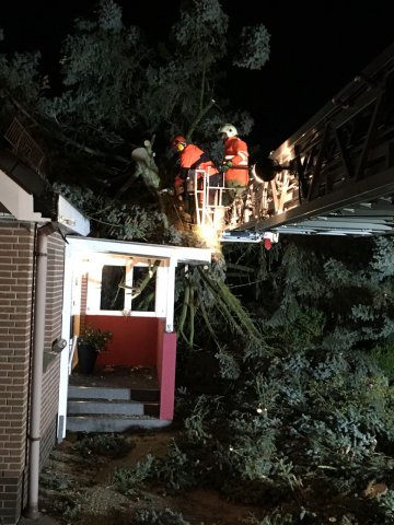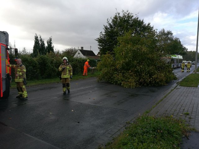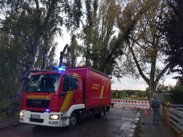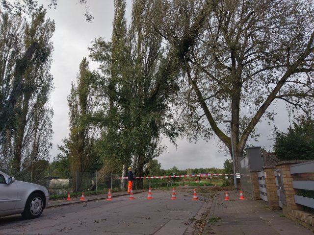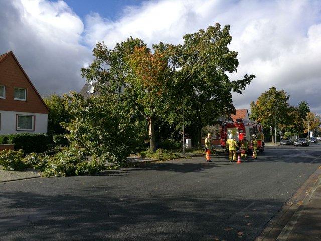 Insgesamt mussten im Stadtgebiet Hannover bis in die Nachtstunden etwa 360 Einsätze abgearbeitet werden. Zum Großteil handelte es sich dabei um abgeknickte Äste, umgestürzte Bäume, welche unter der Last ihres noch vorhandenen Blätterdaches schlichtweg nachgaben, oder Dachziegel die von Hausdächern flogen und eine Gefahr für Passanten dar stellten. Die Ortsfeuerwehr wurde insgesamt zu 30 Einsätzen alarmiert und arbeitete diese mit HLF, LF 20, LF 16 und DL, welche dank unseres abgeschlossenen Hallenbaus ebenfalls schnell einsatzbereit war, ab. Mittels mehrerer Motorkettensägen und ordentlich ‘manpower’, konnten zahlreiche Bäume abgetragen werden und versperrte Verkehrswege, wieder für den öffentlichen Verkehr freigegeben werden.