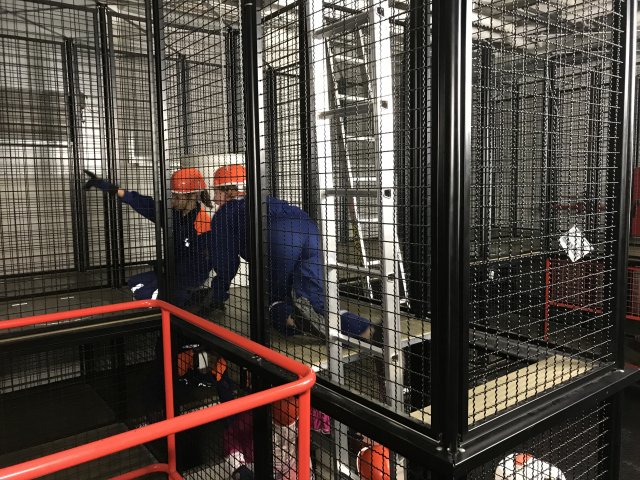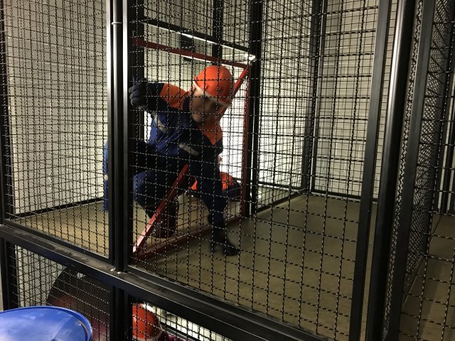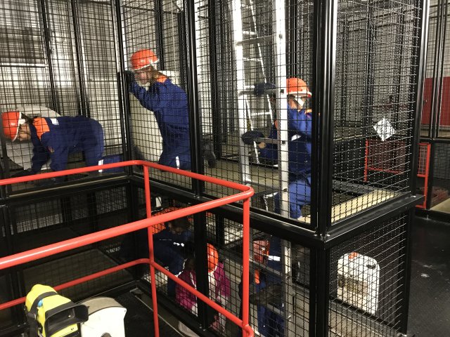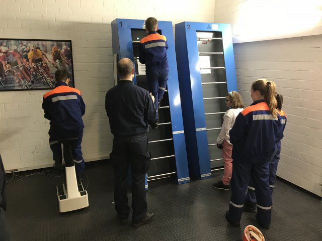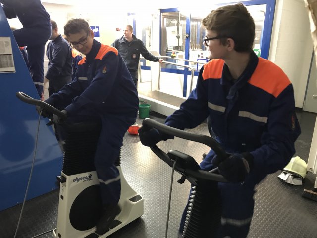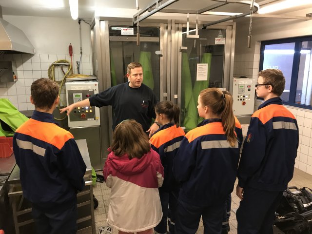 Uns wurden der Aufbau und die verschiedenen Bereiche des Atemschutzzentrums gezeigt und erklärt. Zu den verschiedenen Bereichen zählen unter anderem die „Wäscherei“, wo benutze Atemanschlüsse, Lungenautomaten und Pressluftatmer auseinander gebaut und gereinigt werden. In der angrenzenden Atemschutzwerkstatt werden die gereinigten Bauteile des Pressluftatmers, der Lungenautomaten oder der Atemanschlüsse geprüft und wieder zusammen gebaut. Das Highlight des Abends war für die Jugendlichen der sogenannte „Streckendurchgang. Alle durften zweimal durch die Atemschutzübungsstrecke, wobei es beim zweiten Durchgang galt den Gitterparcours ohne eingeschaltete Beleuchtung zu absolvieren. Im Anschluss hieß es dann, Leiter steigen! Etwa 20 m mussten die Kids auf der Endlosleiter bewältigen.