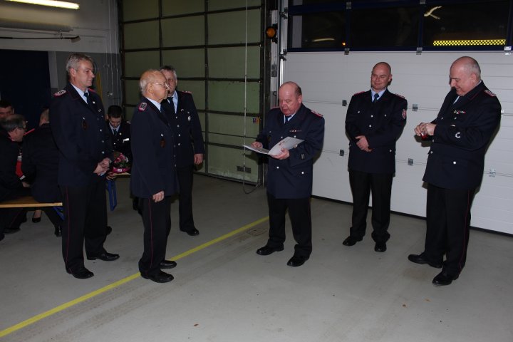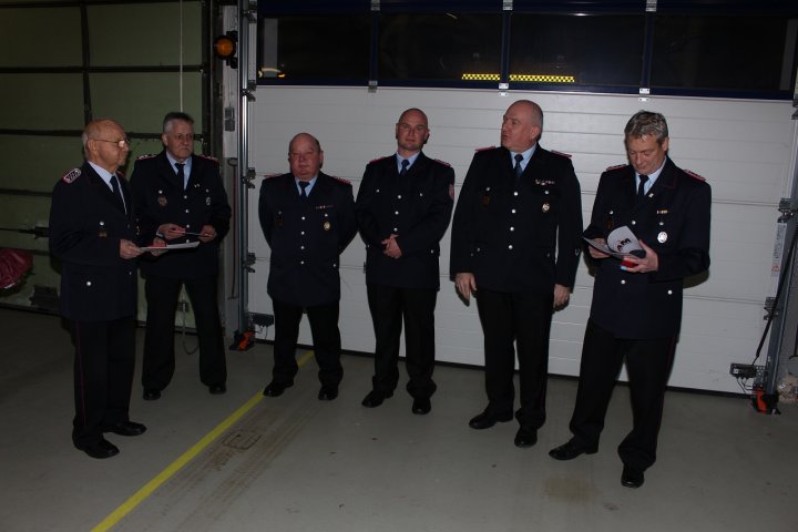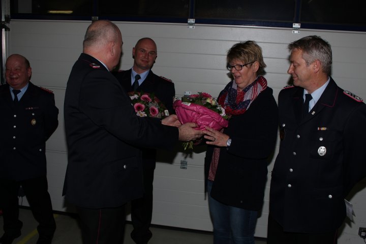 Friedrich Ladage, Mitglied der Altersabteilung, eingetreten 1967, wurde mit der goldenen Ehrennadel für 50. Jahre treue Mitgliedschaft geehrt. Holger Ladage, 1977 eingetreten in die Jugendfeuerwehr und ebenfalls Mitglied der Altersabteilung, wurde mit der silbernen Ehrennadel für 40. Jahre Mitgliedschaft geehrt. Aus den Reihen der Einsatzabteilung wurde der 1992 eingetretene Helgo Funke mit der silbernen Ehrennadel für seine 25-jährige Mitgliedschaft geehrt. Natürlich erhielten auch die Lebenspartner der Geehrten ein kleines Präsent in Form eines Blumenstraußes.