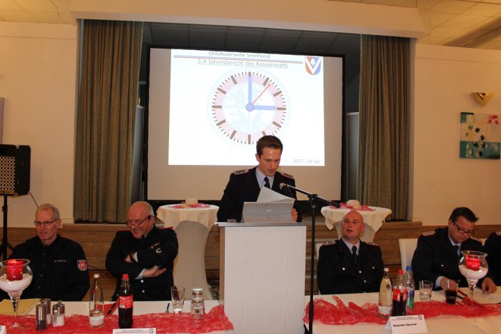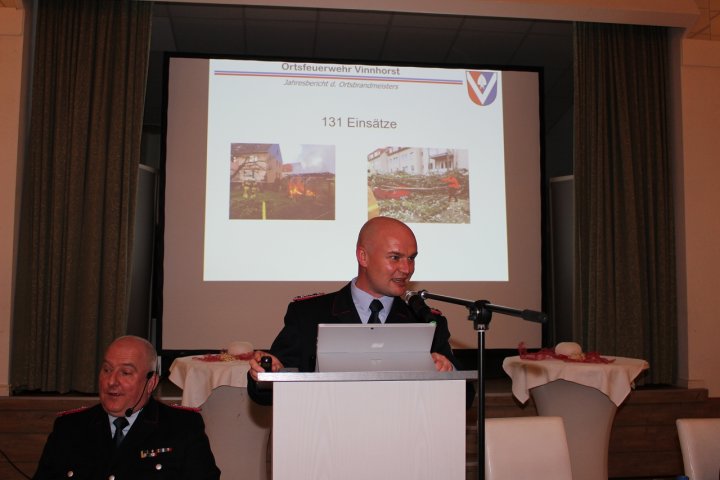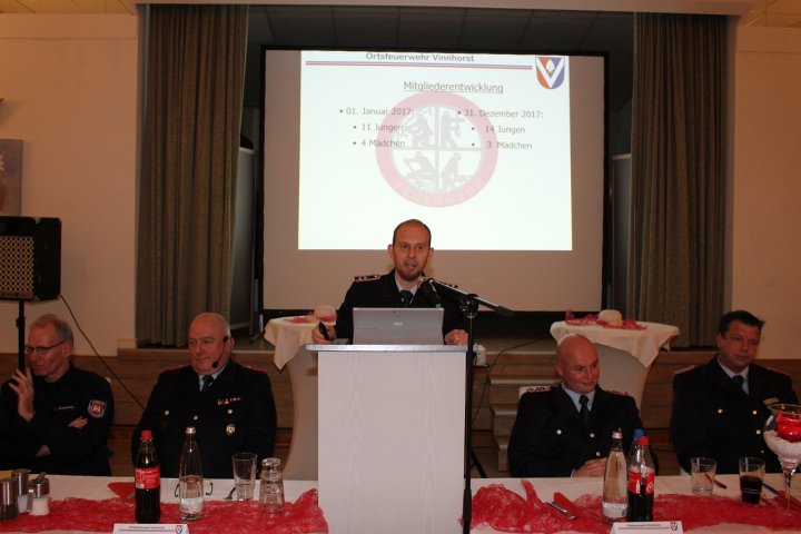 Nach der Begrüßung stellten die einzelnen Abteilungen der Ortsfeuerwehr Vinnhorst ihre Jahresberichte in Daten, Zahlen und Fakten vor. Im Anschluss bedankte sich Ortsbrandmeister Torsten Keune nocheinmal bei allen, welche die Ortsfeuerwehr im Jahr 2017 tatkräftig unterstützt haben und sprach dazu besonders den Hallenbau an. Denn im Juni 2017 konnten wir die neue Fahrzeughalle fertigstellen und einweihen. Auch über die Rückkehr des Löschgruppenfahrzeug (LF) 16/12 nach Vinnhorst wurde mit Freude berichtet.