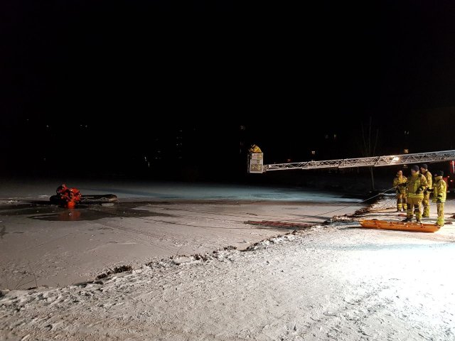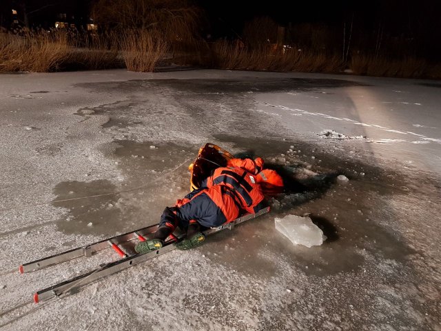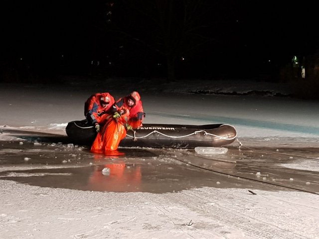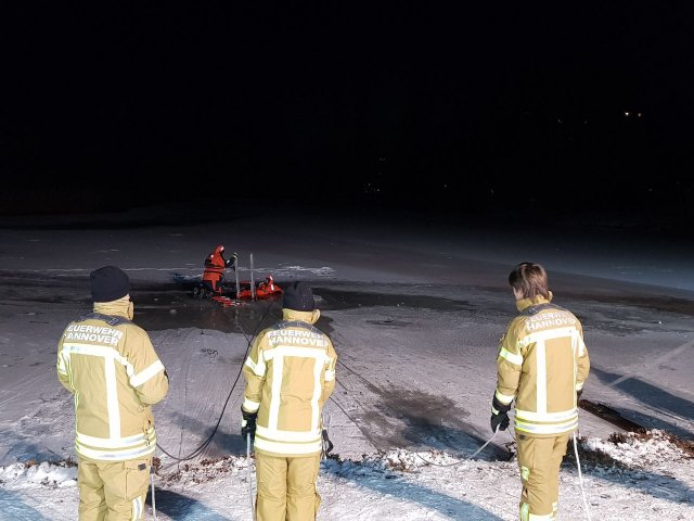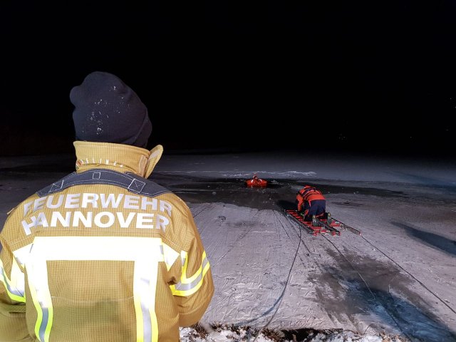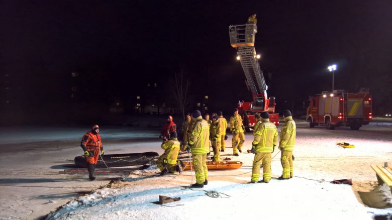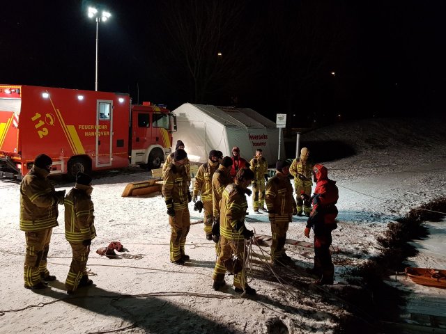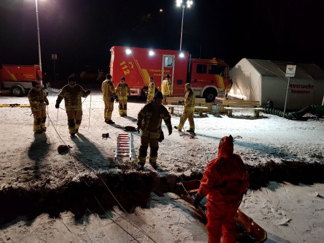 Nach einem kurzen Vortrag über die Versorgung von unterkühlten Personen fuhren wir mit unseren Fahrzeugen zum Übungsort - dem Märchensee im Stadtteil Vahrenheide. Mit Hilfe eines Gummiboots, eines oder mehrerer Steckleiterteile, einer Festzeltgarnitur, eines Spineboards, einer Schleifkorbtrage und unserer Drehleiter übten wir das Retten im Eis eingebrochener Personen. Gesichert wurden die Kameraden dabei mit Feuerwehrleinen. Wer das Eis betrat oder ins Wasser ging, hatte einen Überlebensanzug an, die uns von der DLRG Hannover-Stadt zur Verfügung gestellt wurden. Um sich bei den kalten Temperaturen aufzuwärmen, stand als Umkleide der beheizte Gerätewagen FüKom und ein Schnelleinsatzzelt  (SG 30) mit Heizung zur Verfügung.