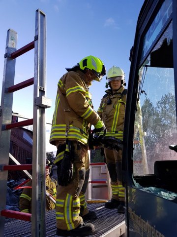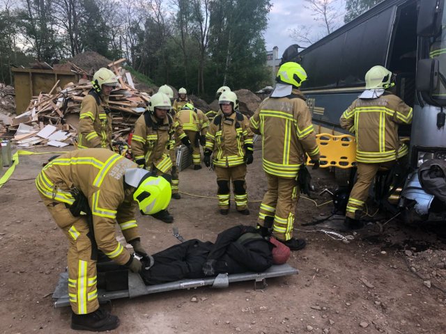Dieser befand sich im Entenfangweg im Stadtteil Ledeburg. Kurz nachdem Eintreffen alarmierte die Übungsleitstelle den MTW zu einem Busunfall mit unklarer Lage. Nach der Lageerkundung gab der Zugführer eine kurze Rückmeldung an die Übungsleitstelle, welche dann unsere beiden Löschfahrzeuge mit dem Alarmstichwort „hm2“ (Personen eingeklemmt Groß) nachalarmierte, da mehrere Personen im Bus eingeklemmt waren. Am Einsatzort eingetroffen übernahm die Besatzung des HLF 20 die technische Rettung der eingeklemmten Personen. Die Besatzung des LF 16/12 baute einen zweiteiligen Löschangriff auf und unterstütze im Anschluss bei der technischen Rettung. Schnell konnte mittels hydraulischen Rettungsgerätes ein Zugang zu den eingeklemmten Personen geschaffen werden.Nach der Befreiung der Personen wurden diese schonend mittels „Spineboard“ aus dem Bus zur Verletztenablage gebracht. Durch die hohe Anzahl an verletzten Personen wurde zwischenzeitlich die Alarmstufe ManV1 (Massenanfall von Verletzten Stufe 1) fiktiv ausgelöst.