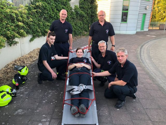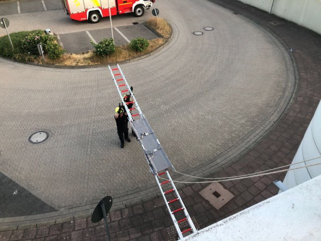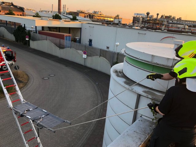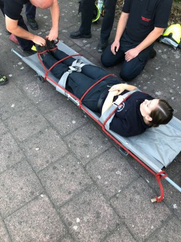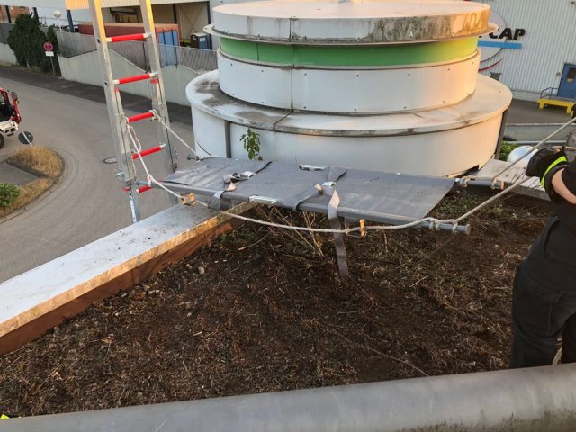 Die Stadtbahnhaltestelle Nordhafen wurde genutzt, um den sogenannten „Leiterhebel“ zu erproben. Dabei wurde auf dem Betriebsgebäude der Stadtbahn eine verletzte Person vermutet. Mit dem „Leiterhebel“ kann eine verletzte Person auf einer Krankentrage gesichert, gerettet werden. Die Trage wurde dabei mit Feuerwehrleinen an einer Steckleiter befestigt und von zwei Personen langsam nach unten geführt.