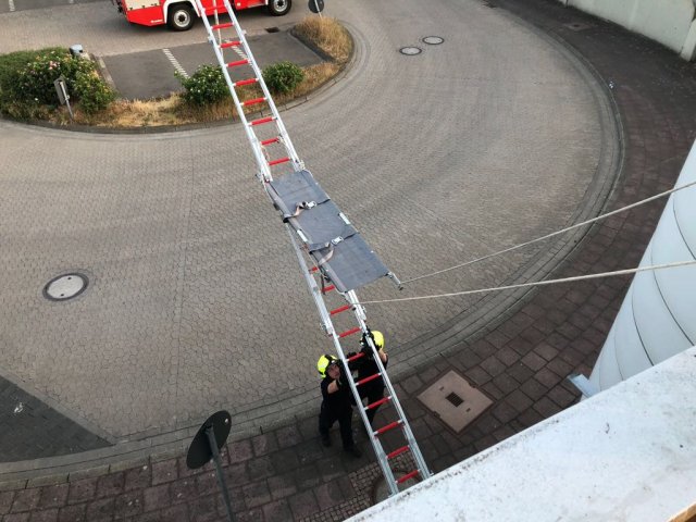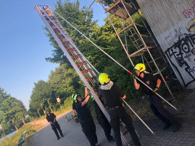 Das Aufstellen der vierteiligen Steckleiter mit einer Rettungshöhe von 7 Metern. Mit dieser wurde an der Brücke „angeleitert“, um auf die Brücke zu gelangen. Der eingesetzte Trupp hatte dabei ebenfalls die Aufgabe, eine Schlauchleitung, sowie Geräte auf die Brücke zu ziehen.