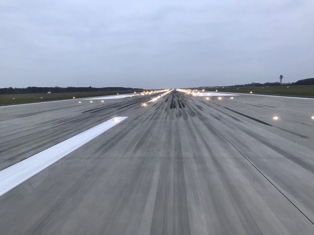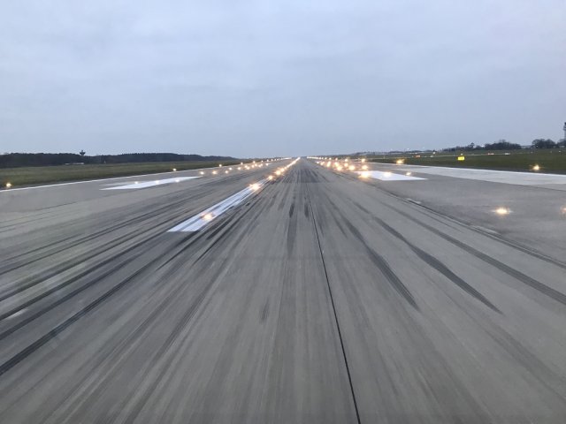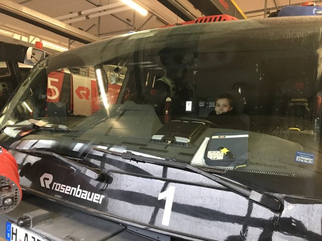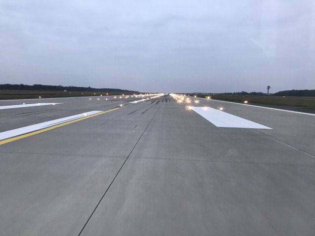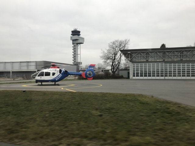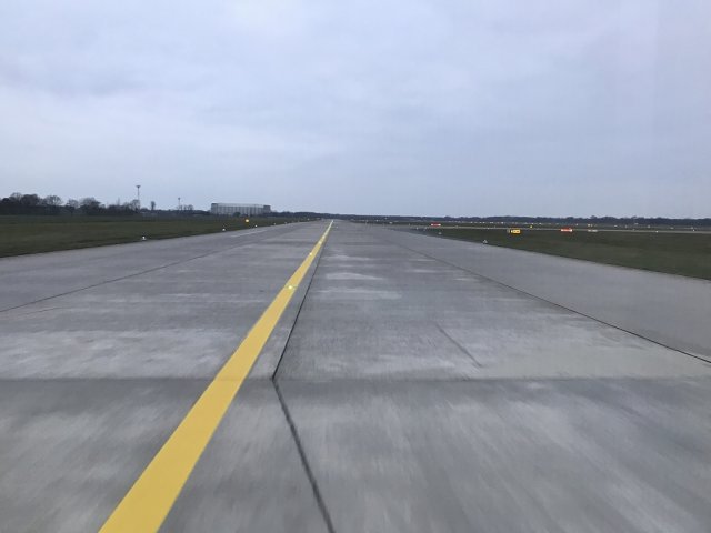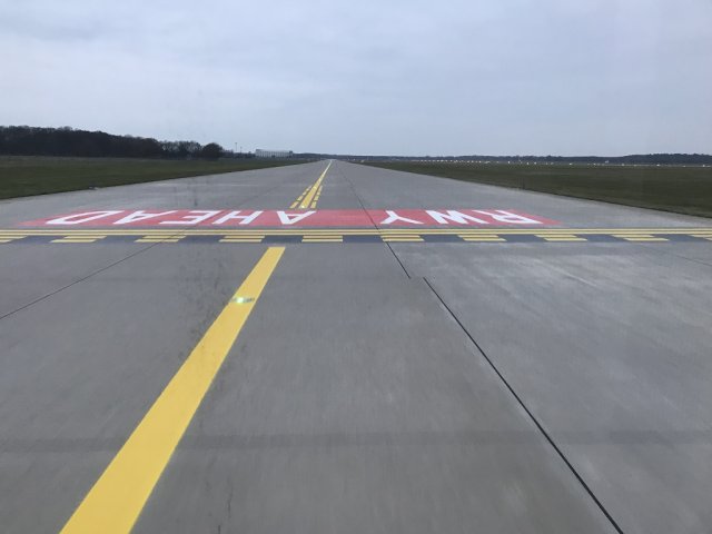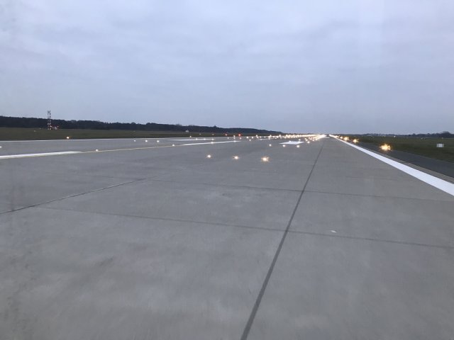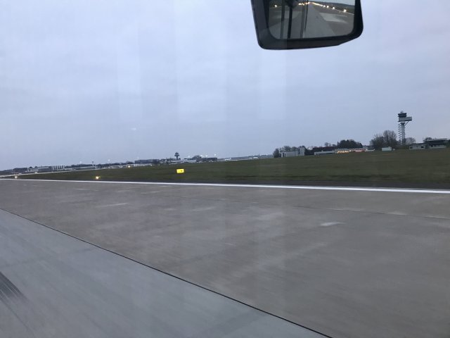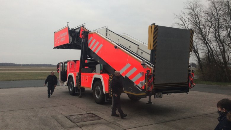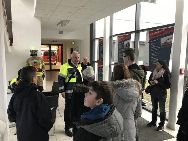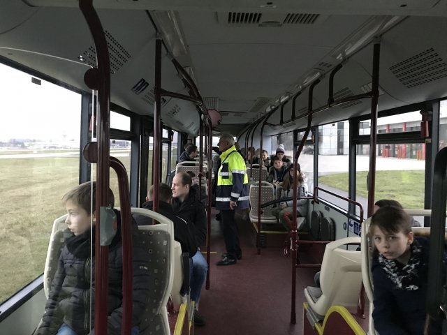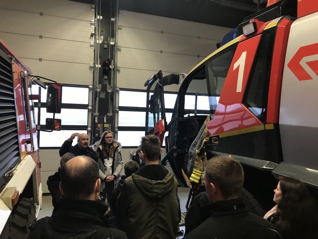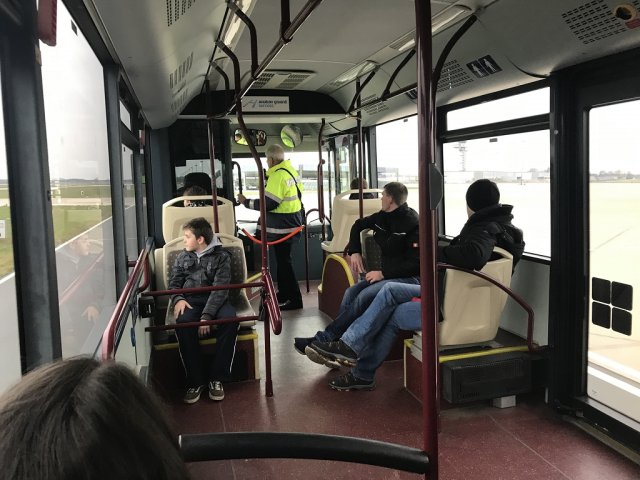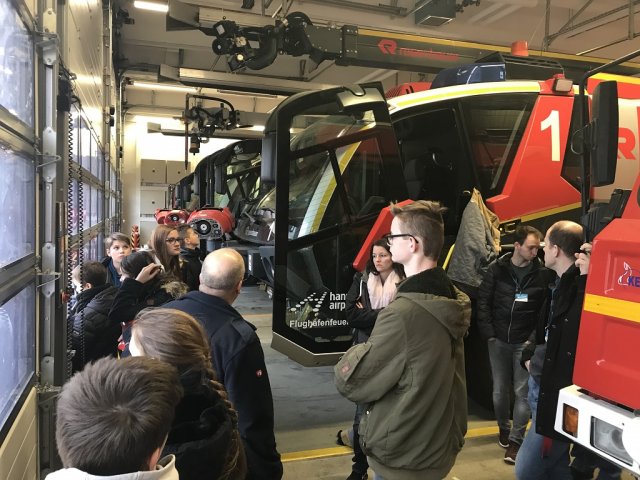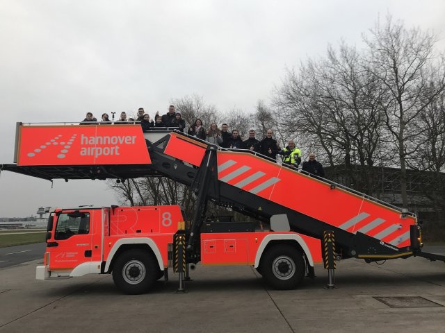 Dort angekommen empfingen uns ein Mitarbeiter des Flughafens und unser Kamerad Dirk Heidenreich, welcher hauptberuflich bei der Flughafenfeuerwehr arbeitet. Mit Besucherausweisen ausgestattet gingen wir zu den Sicherheitskontrollen, wo jeder auf gefährliche Gegenstände kontrolliert wurde. Im Anschluss begaben wir uns zum Vorfeld, wo uns ein Bus abholte und uns zur Wache der Flughafenfeuerwehr brachte. Vor Ort erzählte Dirk uns etwas über die Aufgaben der Flughafenfeuerwehr und erklärte uns die Besonderheiten der verschiedenen Einsatzfahrzeuge. Auf der neuen Rettungstreppe machen wir dann noch ein Gruppenfoto. Nach einer kurzen Pause mit Keksen und Getränken holte uns der Bus wieder ab. Es ging aber nicht wieder zum Terminal, sondern in Richtung „Nordbahn“. Nachdem der „Busfahrer“ sich die Zustimmung des Towers zum Befahren der Nordbahn eingeholt hatte, fuhren wir bei voller Befeuerung einmal die ganze Start- und Landebahn ab. Auf dem Rückweg zum Terminal führte unsere Fahrt noch an den Flugzeugwartungshallen vorbei. Am Terminal angekommen verabschiedeten und bedankten wir uns für die großartige und interessante Führung und besuchten noch kurz die Aussichtsterrasse des Flughafens.
