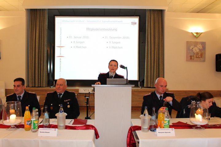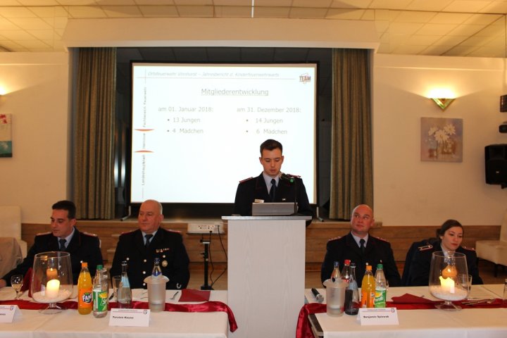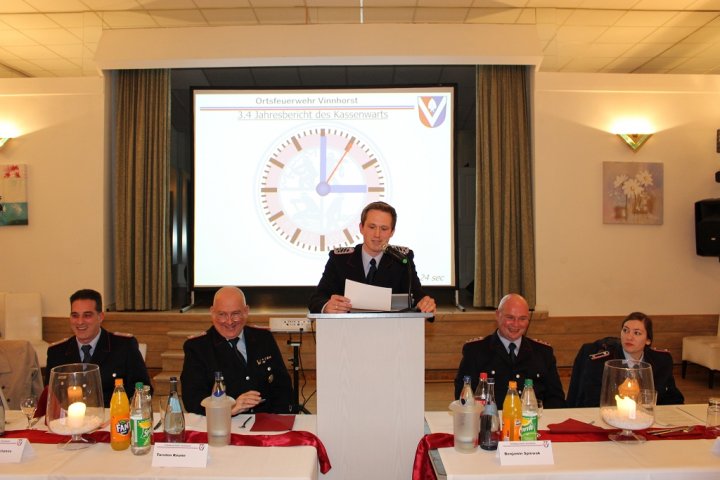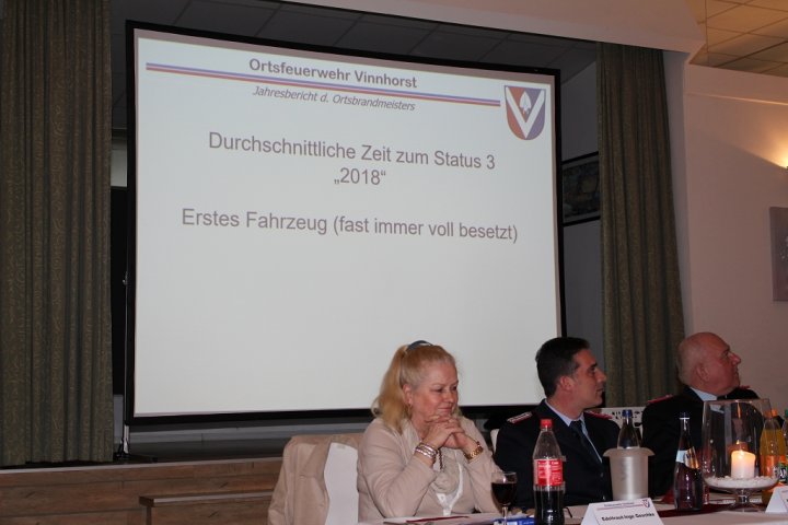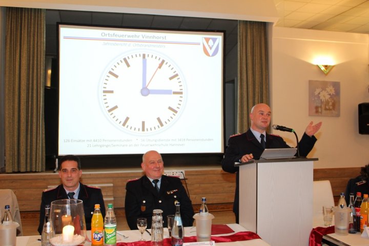 Nun stellten die einzelnen Abteilungen der Ortsfeuerwehr Vinnhorst ihre Jahresberichte in Daten, Zahlen, Fakten und vielen Fotos vor. Im Anschluss bedankte sich Ortsbrandmeister Torsten Keune bei allen, die die Ortsfeuerwehr im Jahr 2018 tatkräftig unterstützt haben. Des Weiteren berichtete er, dass bei einer Mitgliederversammlung im Dezember letzten Jahres einige Positionen im Kommando neu gewählt wurden. Julia Richter wurde zur neuen Schriftführerin gewählt, Eike Jagemann wurde in seinem Amt als Kassenwart bestätigt, als neuer Jugendwart wurde Gregor Fleischmann gewählt, die Funktion des 1. Gruppenführers besetzt jetzt Marcel Gotzmann. Christian Köhler wählte die Ortsfeuerwehr als Beisitzer und Leiter unseres Veranstaltungsteams. Alter und neuer Leiter der Fachgruppe Führung und Kommunikation ist Tobias Keune. Im Anschluss stand am Abend die Wahl eines neuen Kassenrevisors auf der Tagesordnung - dieses Amt wird zukünftig Lutz Gumtau übernehmen.