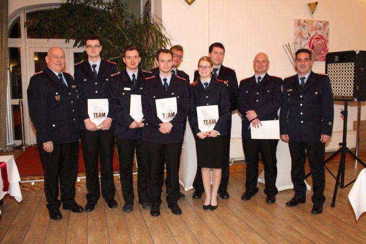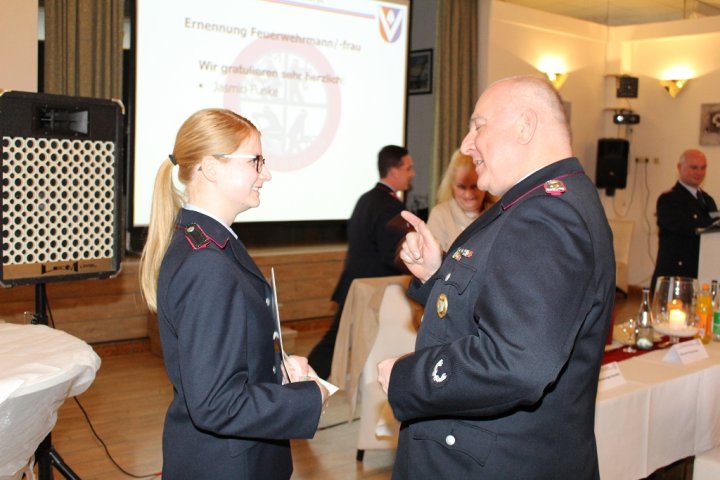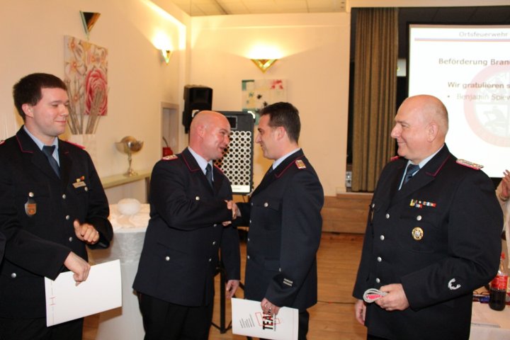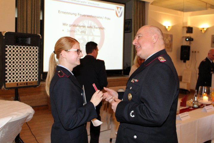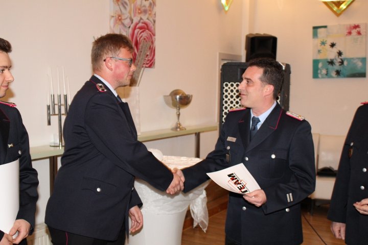 Bevor der Abend mit dem traditionellen kalten Buffet beendet wurde, durften sich einige Mitglieder über ihre Beförderungen freuen. Nach bestandenem Truppmannlehrgang Teil 1 wurde Jasmin Funke zur Feuerwehrfrau ernannt. Maurice Ließ und Henning Cech wurden zum Oberfeuerwehrmann befördert, Nando Hapke und Steven Niebuhr zum Hauptfeuerwehrmann und Stephan Libera zum 1. Hauptfeuerwehrmann. Den Dienstgrad Brandmeister erhielt unser stellvertretender Ortsbrandmeister Benjamin Spiewak.