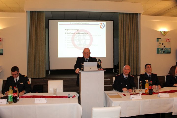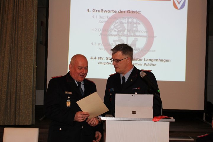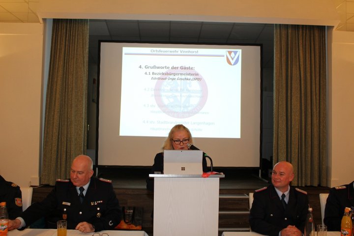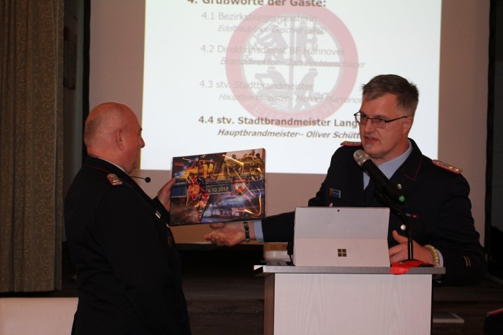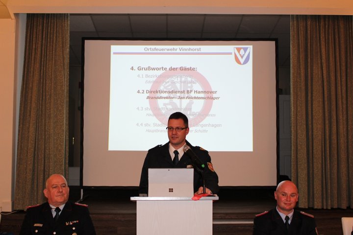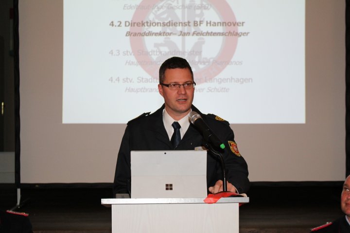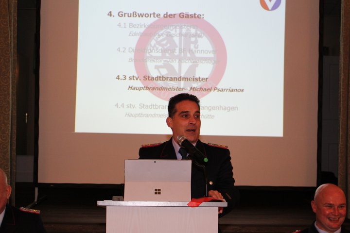 Ortsbrandmeister Torsten Keune eröffnete pünktlich um 19 Uhr die diesjährige Versammlung. Aus dem Stadtfeuerwehrkommando konnte die Ortsfeuerwehr den stellvertretenden Stadtbrandmeister Michael Psarrianos begrüßen. Die Berufsfeuerwehr wurde von Martin Barzak (Feuer- und Rettungswache (FRW) 1), Marc-Oliver Spohr (FRW 4), Marina Scholze (FRW 2) und Jan Feichtenschlager (FRW1) vertreten. Auch den Ortsbrandmeister der Ortsfeuerwehr Stöcken, Udo Rossenfeld, und den stellvertretende Stadtbrandmeister der Stadt Langenhagen, Oliver Schütte, konnten wir begrüßen. Aus den Reihen der Politik sind die Bezirksbürgermeisterin Edeltraut-Inge Geschke (SPD) und Angelika Jagemann (CDU) unserer Einladung gefolgt.