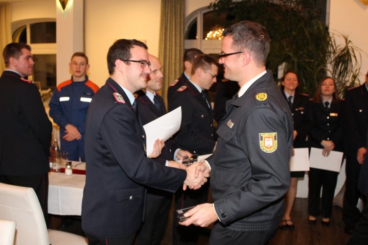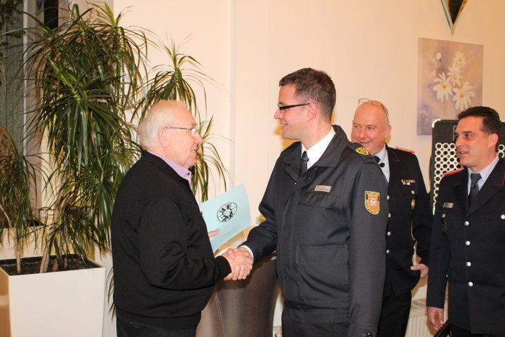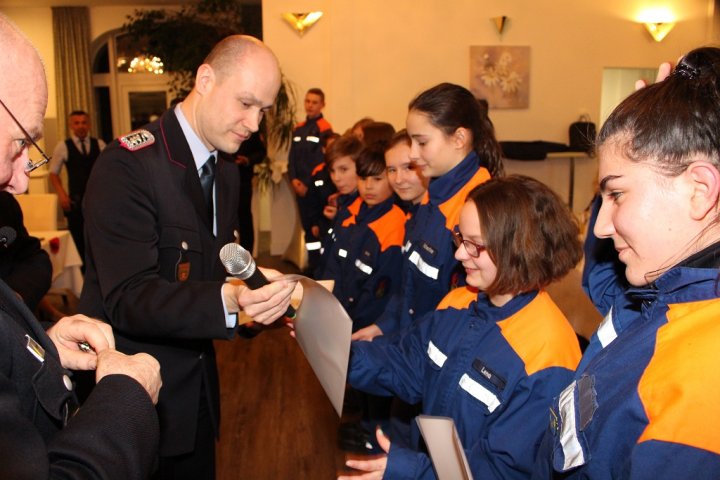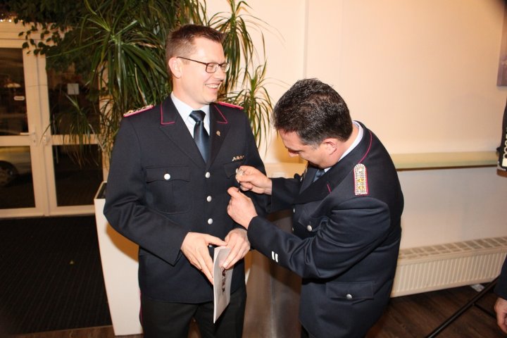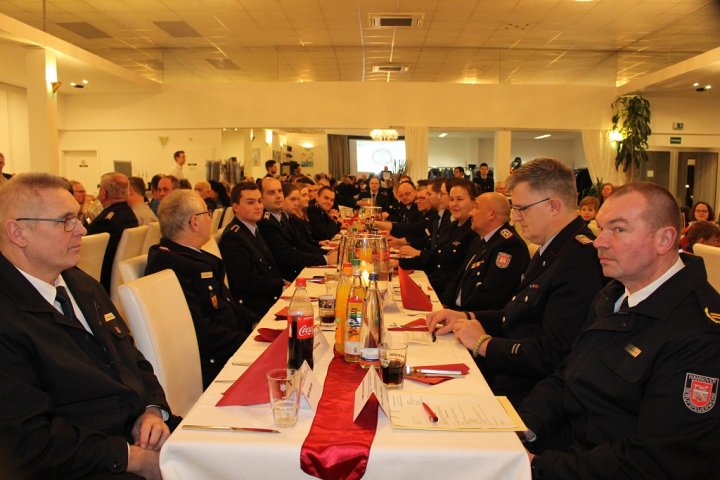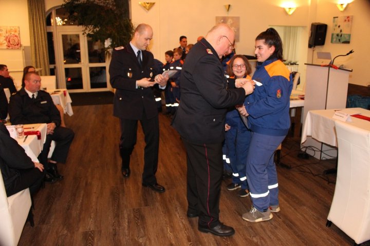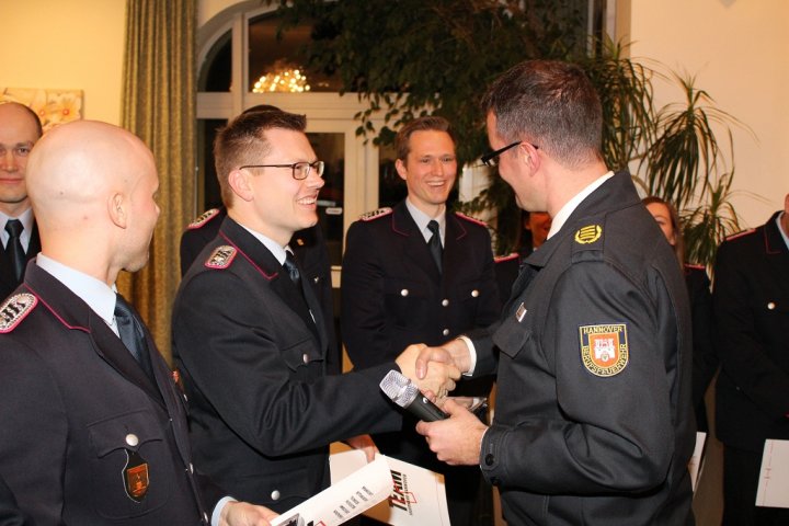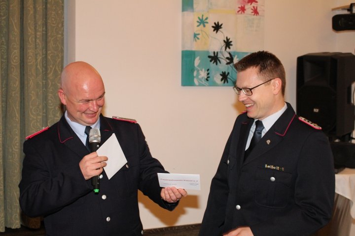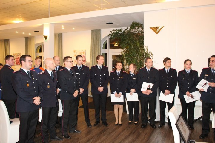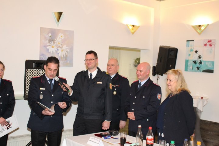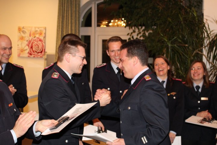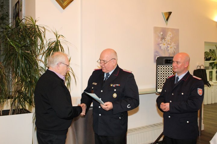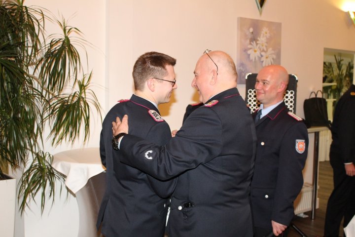 Bevor der Abend mit einem, in der Geschichte der Ortsfeuerwehr erstmalig warmen Buffet beendet wurde, durften sich einige Mitglieder über ihre Beförderungen freuen. Nach bestandenem Truppmannlehrgang Teil 1 wurden Alina Schönewolf, Simon Priemer und André Kay zum Feuerwehrmann (SB) ernannt. Justin Hintzke wurde zum Oberfeuerwehrmann befördert, Julia Richter zur Hauptfeuerwehrfrau und Katharina Schimmer zur 1. Hauptfeuerwehrfrau. Den Dienstgrad Hauptlöschmeister erhielten Marcel Gotzmann, Eike Jagemann, Tobias Keune, Christian Köhler und Holger Libera. Im weiteren Verlauf erhielt der Kamerad Christian Köhler eine Ehrung für 25-jährige Mitgliedschaft. Hans Fleischmann wurde für 50-jährige Mitgliedschaft geehrt. Auch die Ortsfeuerwehr benötigt ab und zu Unterstützung. Friedrich Baumgarte ist stets zur Stelle, wenn ein Traktor benötigt oder ein Übungsobjekt für die Jugendfeuerwehr gesucht wird. Aus diesem Grund erhält er verdienterweise die Ehrenmedaille des Landesfeuerwehrverbandes.